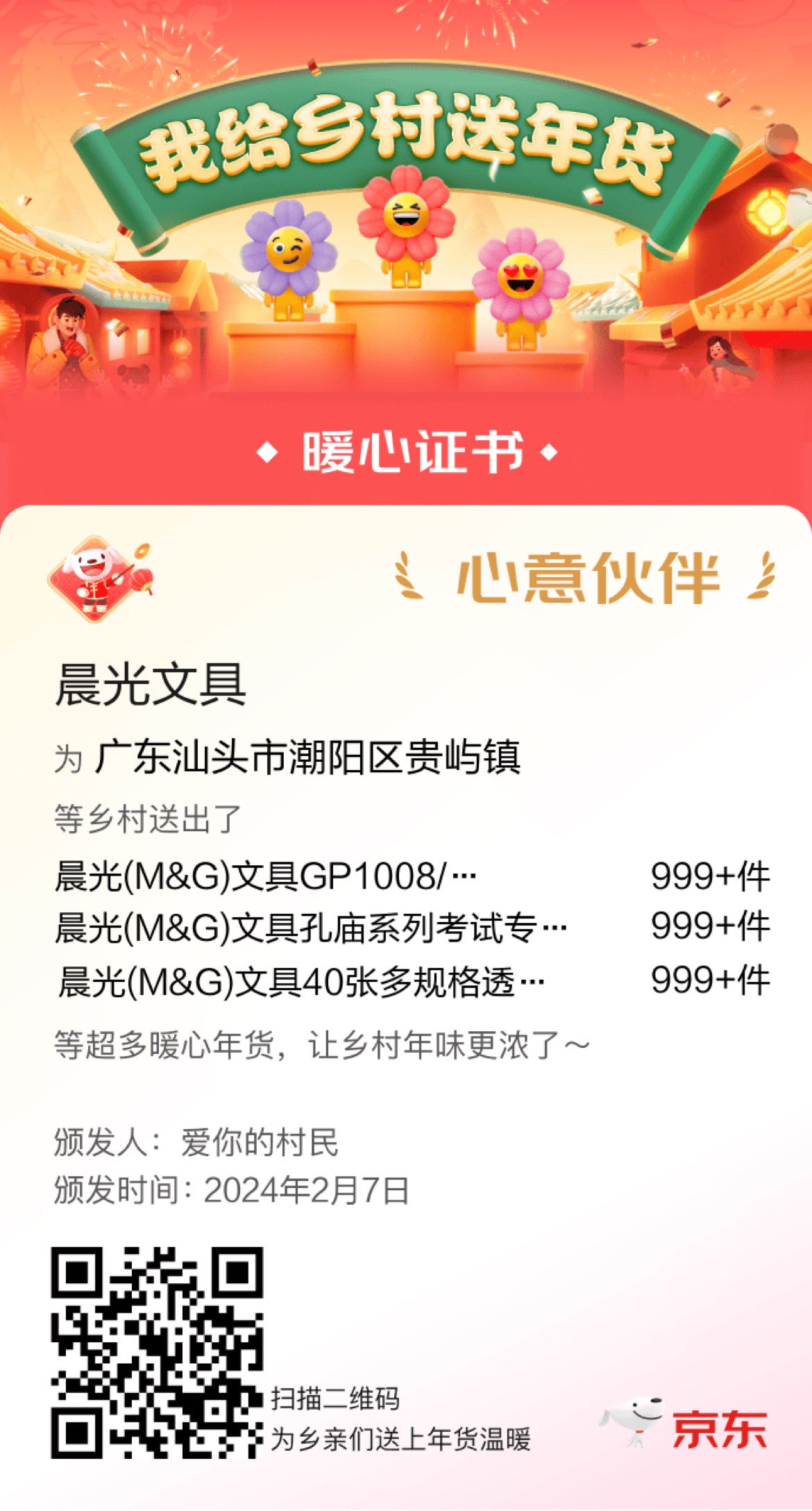 攜手京東“我給鄉(xiāng)村送年貨”活動 晨光為家鄉(xiāng)送出7000件愛心文具